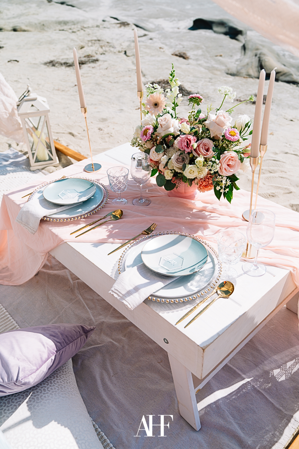Opt for a blush linen table cloth with white and golden accents. As a table centerpiece – get a large pink bouquet of white and pink flowers, such as peonies or roses to add to the feminine vibe. Light pink glassware or rose-tinted candles will finish the look beautifully.